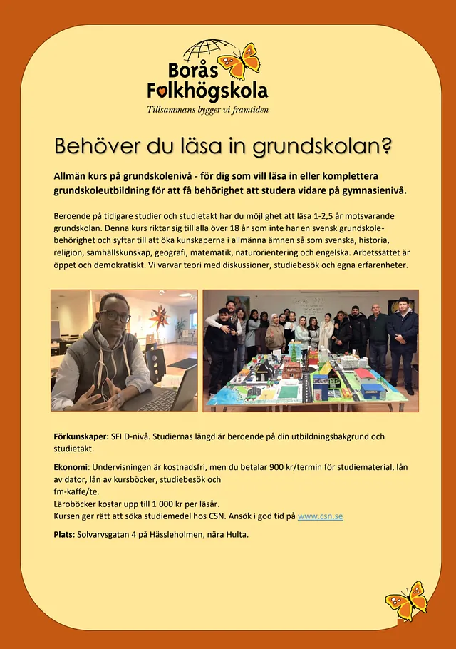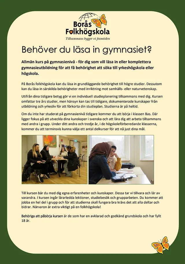 För frågor och anmälan till våra folkhögskolekurser ring till expeditionen 033-12 52 00.